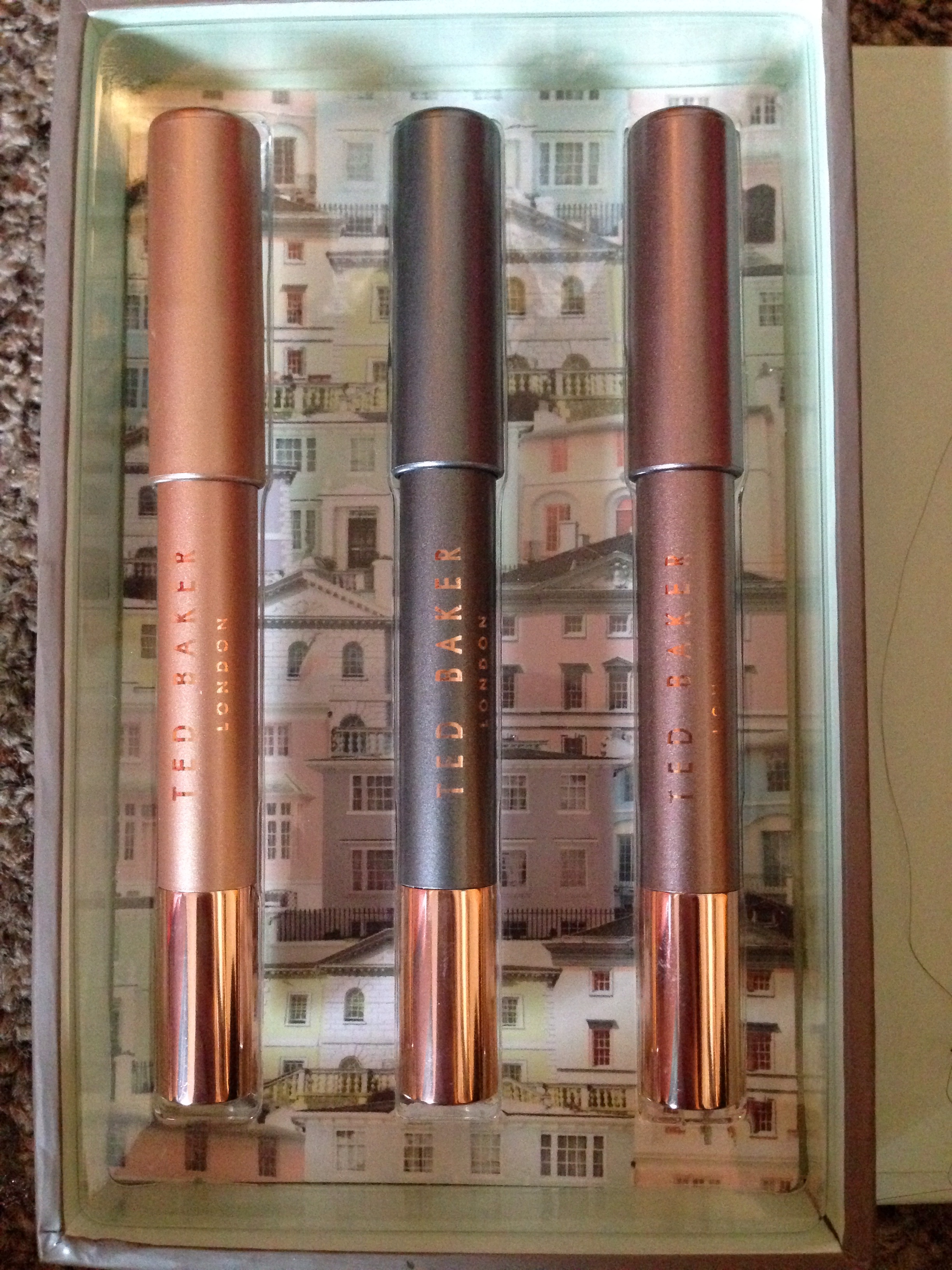 I really like the packaging of this and what is good, is you can take all the makeup out of the plastic and put other eye makeup that you have in the box, so it has a good storage use. I also like that it comes in a box that looks like a book. It’s just so pretty. Everything is either got a coat of gold on in one way or another, for example either the lettering or the ends of the eye crayons, to give it that Ted Baker signature look. I also love it’s theme of all gifts this year which is the print of pastel town houses, which is inside the box on this particular gift set. Again so pretty!