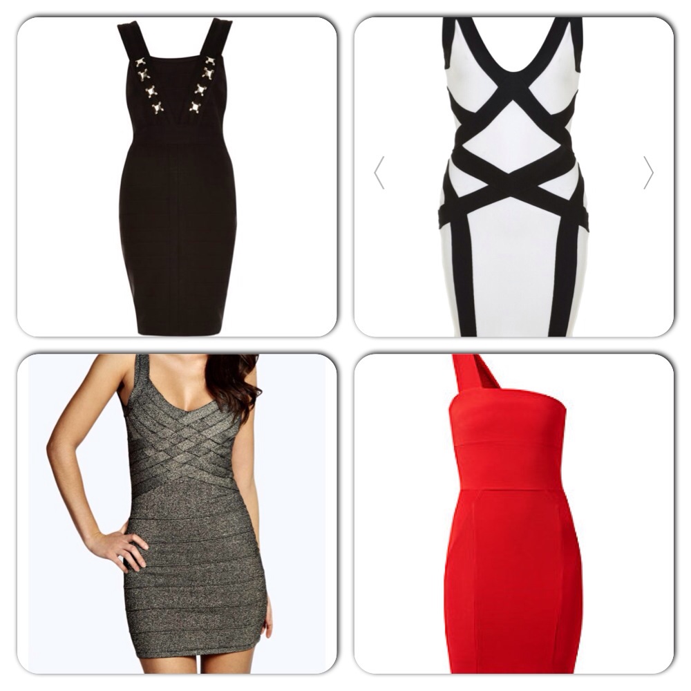 Bandage dresses are great aren’t they? An illusion to the way you look. Here I’ve got a River Island black one. It doesn’t look bandage as you can’t see because it’s black, but it is. A good way to update your LBD collection. Then my favourite one out of the four is this metallic dress. Love the colour, it just has a real nice textured look to it. Then we have this monochrome one, I love the style and the black band which separates the different compartments of your body up. Then we New Looks intake on it with a gorgeous colour of red and for something a bit different, it’s one shoulder. I like the dresses but I’m not a total body con fan. I do think it’s time for these to have their spotlight though.
