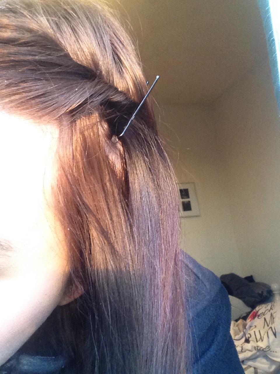For this one all you need to do is grip the sides of the front bits of your hair or your bangs, to the sides of your head. That way your hair stays out your way for the rest of the day.