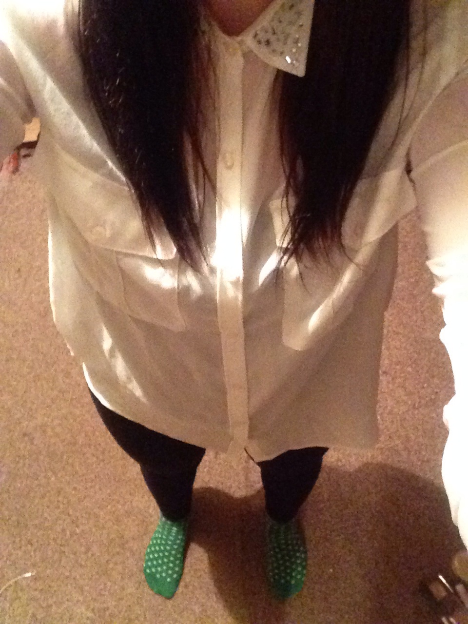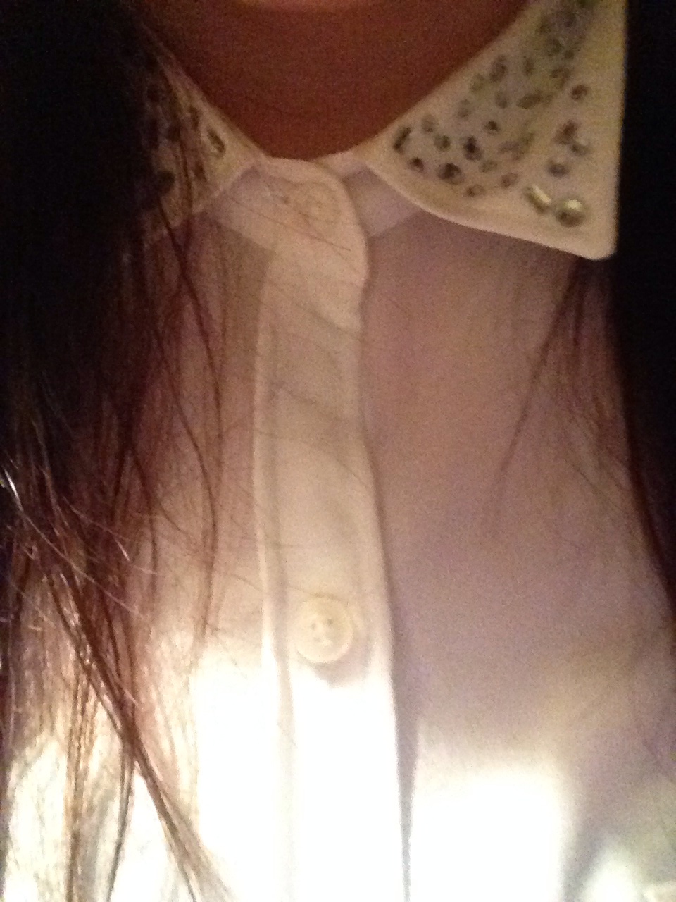 Hey guys! Just something I threw on whilst I was going out the other night. I put on just some plain black leggings, because leggings are just so comfy, I literally just live in them. Then I just threw over a white shirt and I really like this shirt, mainly for the diamonte detailing on the collar. You can dress this up or dress it down, it’s entirely up to you. It’s oversized as well and you can wear the sleeves either up or down, buttoned up or left undone. You could wear it over jeans, shorts, wet look leggings, the options are endless. Then you could just pair with some cute ankle boots or flat pumps to finish it off, and an oversized bag.