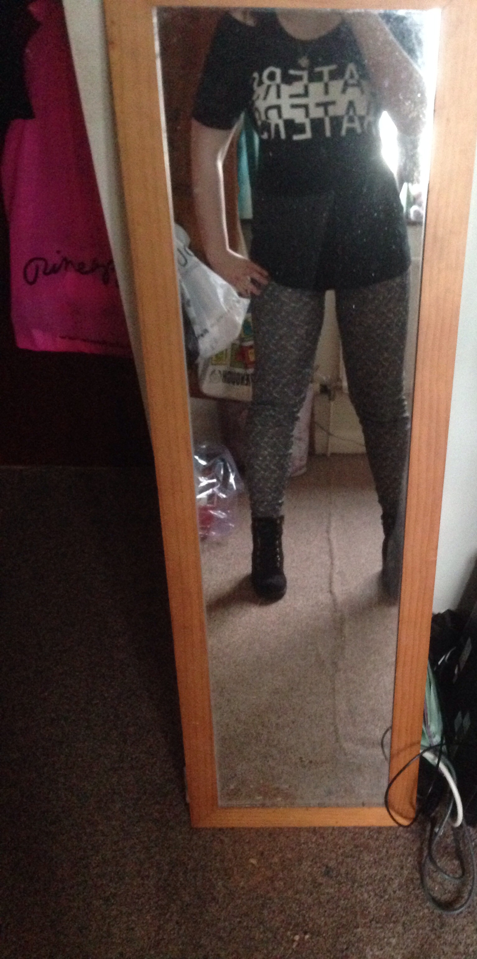 Hey everyone! I’ve had some really lovely feedback from some of you this weekend, especially on Twitter, so thank you so much, I really appreciate it and it’s lovely to here. Last outfit of the day for a bit I want to move on to some other bits next week. Here I’m just wearing my laters haters slogan tee. I shall leave links to the items of clothing below. Then I’m wearing my printed jeggings. They’re really comfortable and have an elastic ages waist. I love these, I literally got them a week ago and have worn them quite a bit since. They look so textured and the price was a bargain. I just went for a laid back, comfortable look. You could dress these jeggings up or down though, a really nice oversized black coloured blouse would look nice over the top, or an oversized cosy knitted jumper.