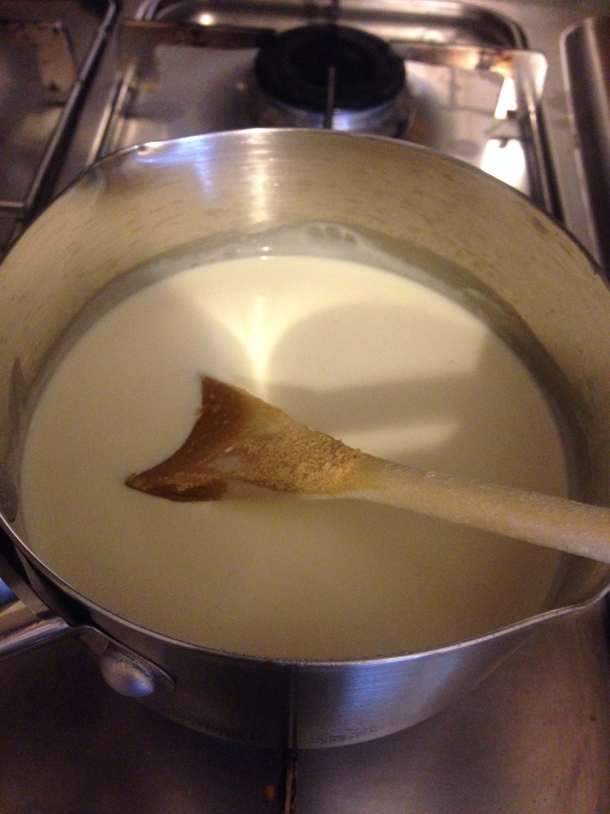 4) To make the filling, put the cream and milk in a saucepan over a low heat and bring to a simmer.
