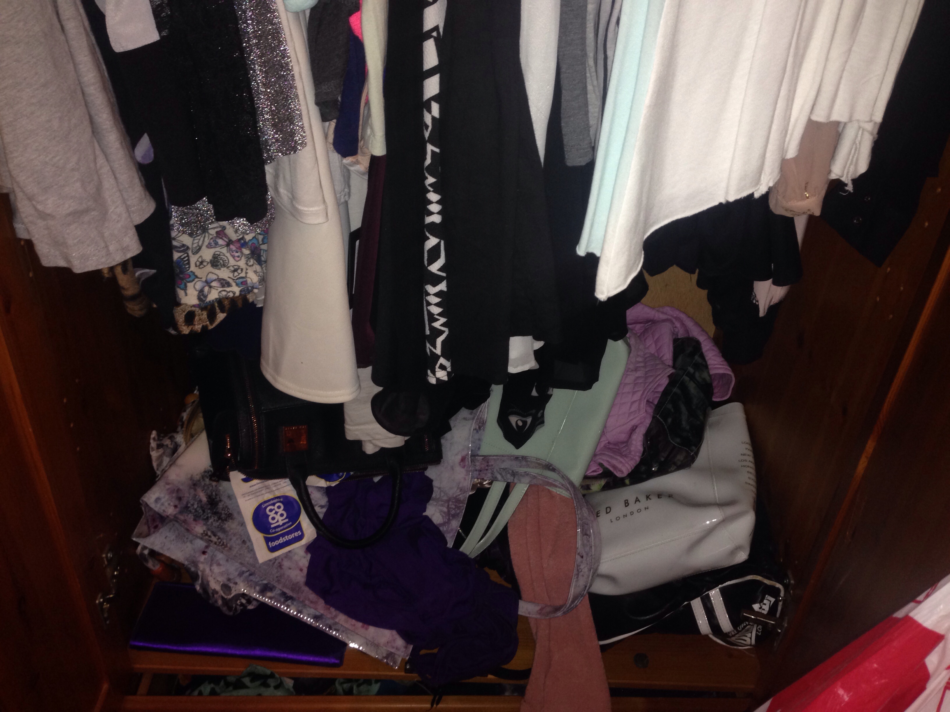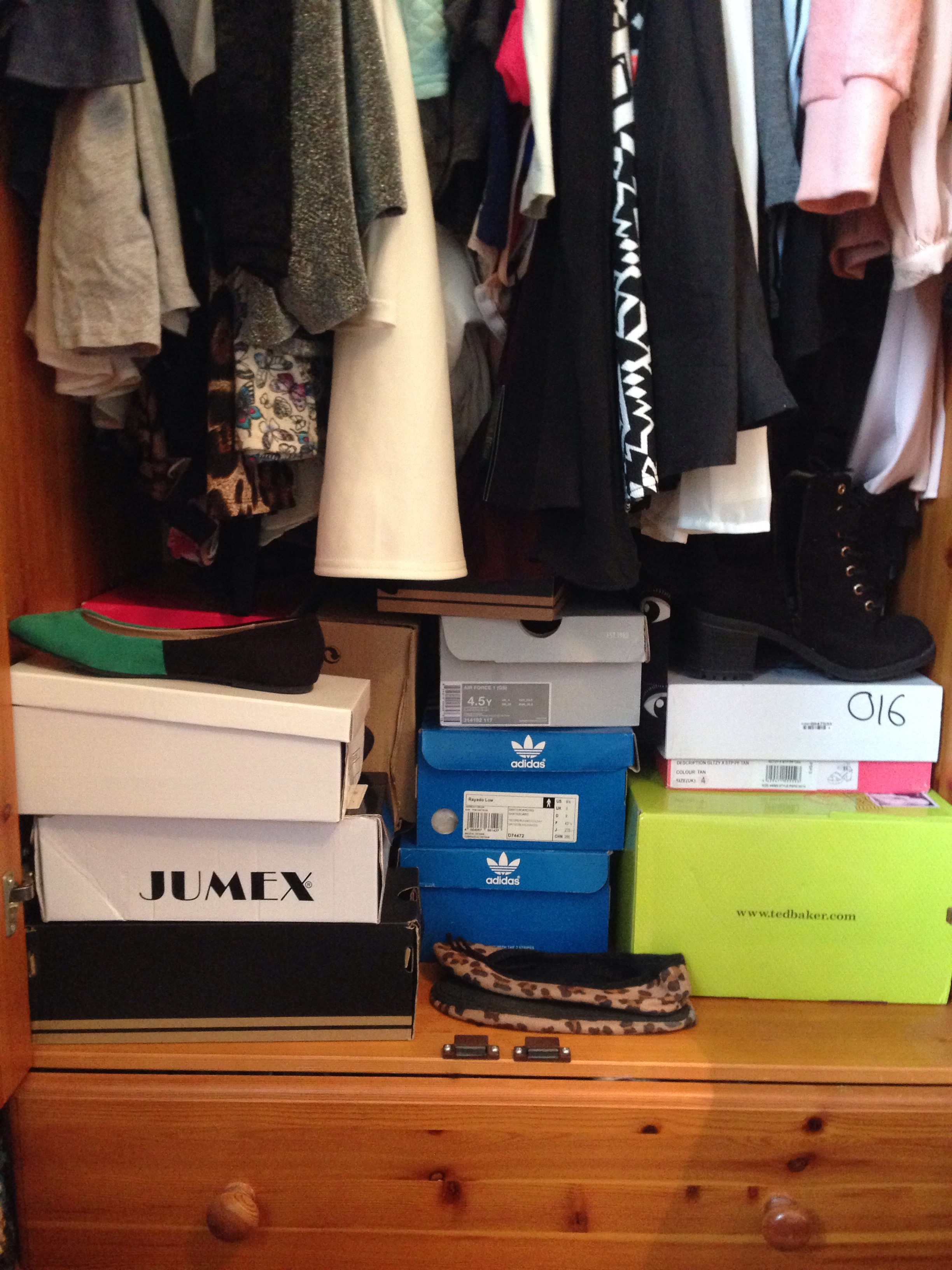 This was one of those jobs I’ve kept putting off and eventually I will sort out the top of my wardrobe, and the rest of my room in that matter. I can’t believe I’m showing you this picture because it’s awful but at least I can show you I’ve done something about it. As you can see it was really messy and there was just allsorts in there. Now I’ve got just my shoes in there neatly in shoe boxes. This is a really good way of keeping your shoes tidy. What I’m thinking of doing to be even more organised, is to take pictures of the shoes in each box and then stick them on the shoe box. This way I know what is in the shoe box, and when it comes to looking for a certain pair of shoes, I can just look at the box, instead of getting them all out and knowing me, making a big mess.