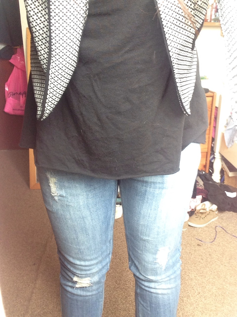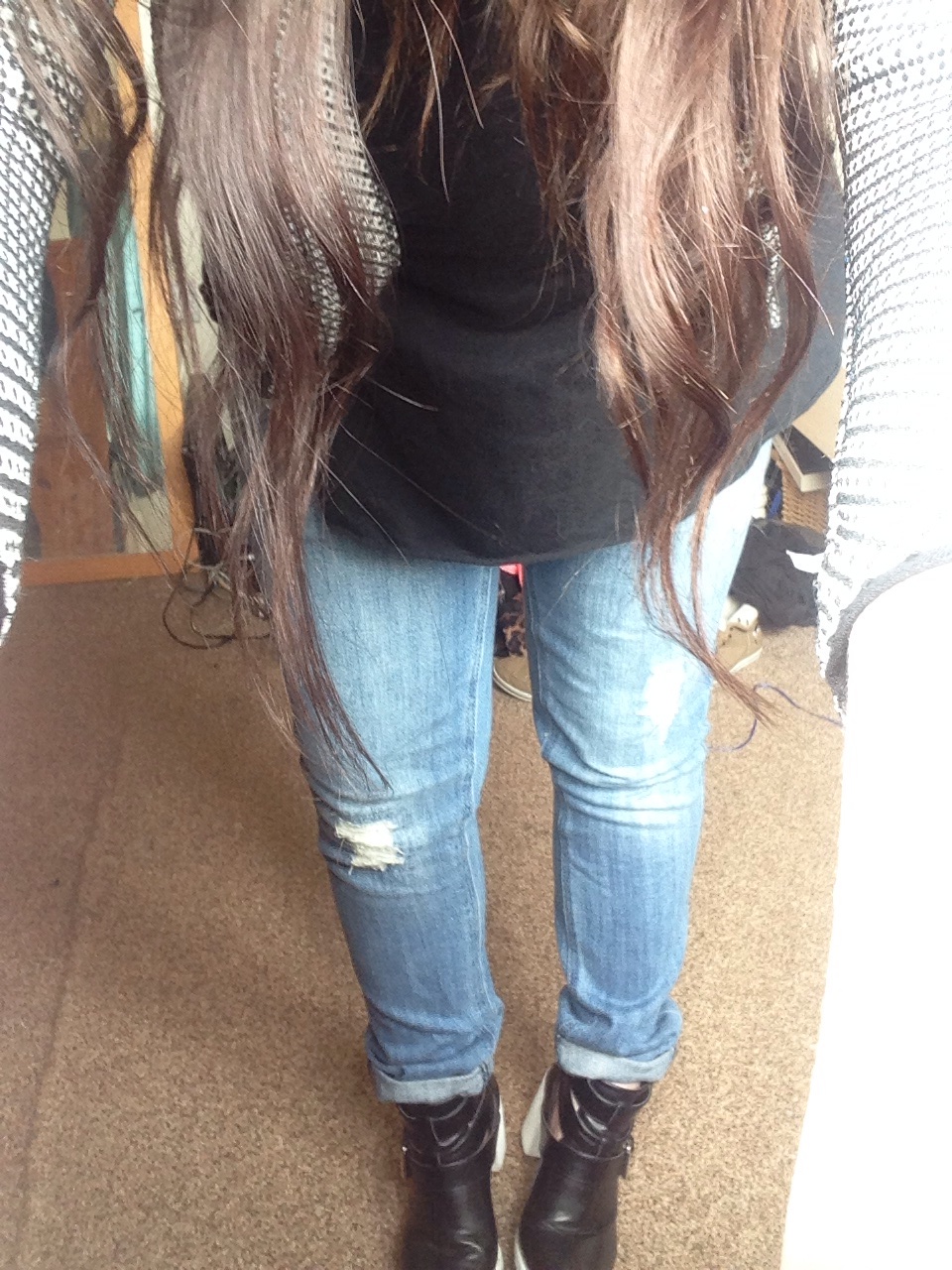 Here’s another outfit I’ve put together and it’s one of my favourite ones in a long time and yes I’m wearing jeans! Here I wore my only pair of jeans and for the first time in like a year. I really like the rips in them and they are light denim. With these jeans I put on my second favourite pair of black and white buckled wedged ankle boots. I then just had a plain black vest on with a black and white blazer type thing to match the black and white monochrome boots.