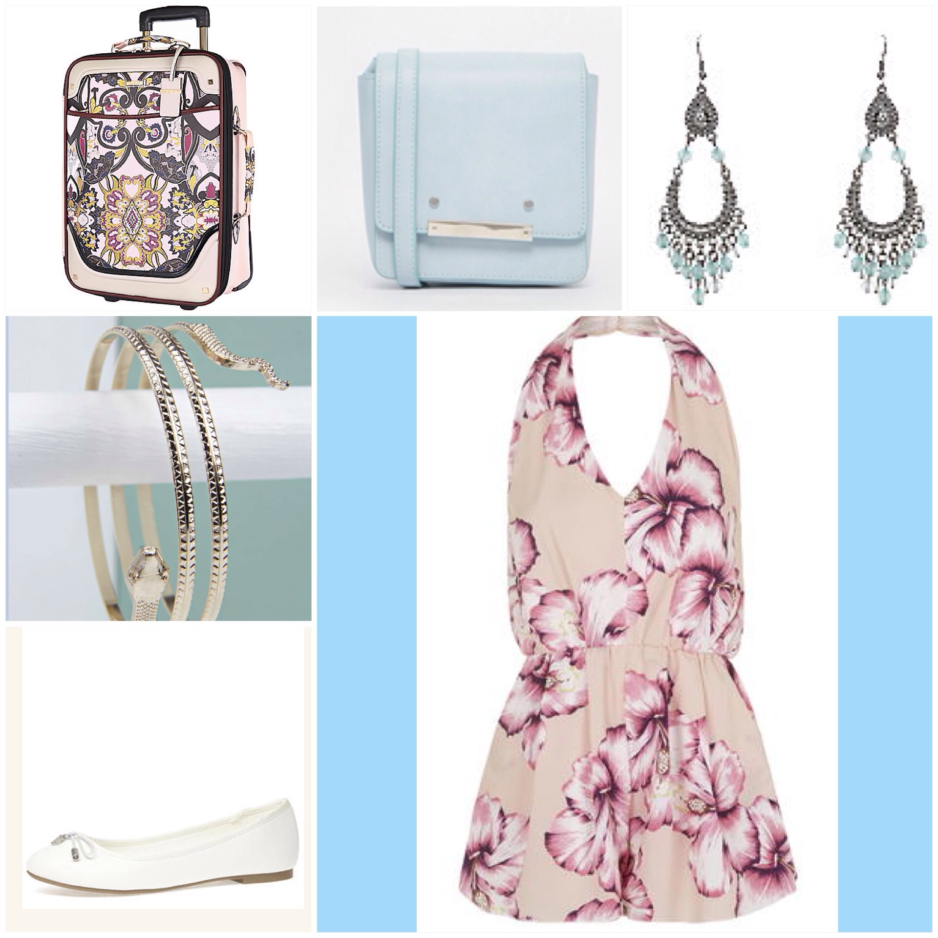 This is one of my favourites out of all 7 days. I love the contrast in colours I’ve picked with this one as they are all baby colours. I really lovely this suitcase, the detail on it is incredible and you can look good going to the airport with this. The playsuit is stunning and I love the flower design detail on the fabric. To not make it so pink, I’ve put in these really pretty duck egg blue earrings and a shoulder bag for when your hands are full, but big enough for all your essentials. I love the snake cuff as its so different and unique and then because travelling you want to be comfy, I’ve found this lovely basic white pumps.