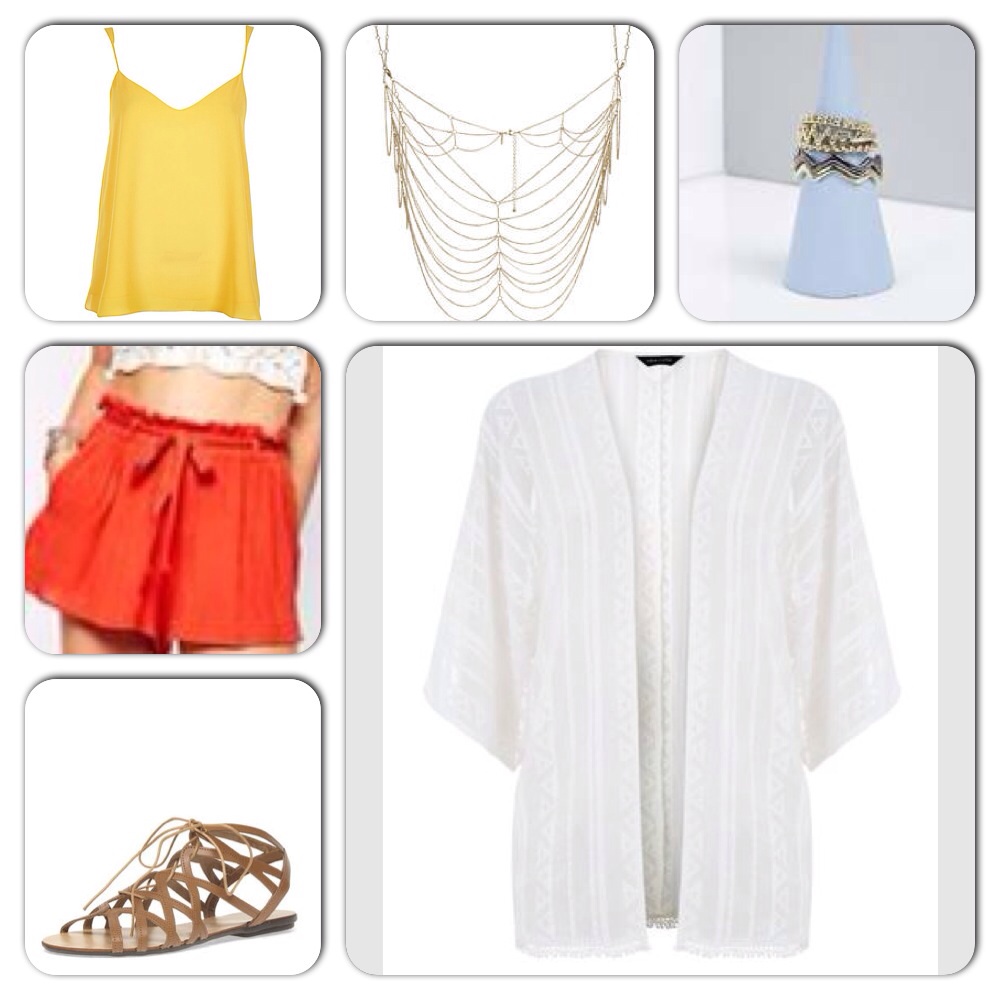 A brightly coloured outfit with this one, with a lot of different textures and lengths. This outfit Is all about the shorts, I picked the shorts first as I loved them, and worked everything else around them. I wanted to keep this outfit very light so I put together the yellow cami which is a wardrobe essential, I have about four cami’s in my wardrobe, which make good basics. Then you can throw on this white kimino, that will go with everything, still keeping the outfit light. The chain bralet and rings is just to add something more to the outfit, otherwise it looks quite plain and then I fell in love with these gladiator sandals to add another colour to the mix.