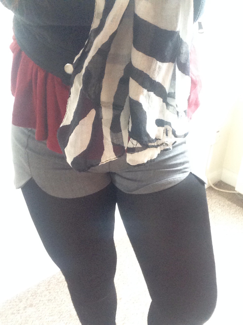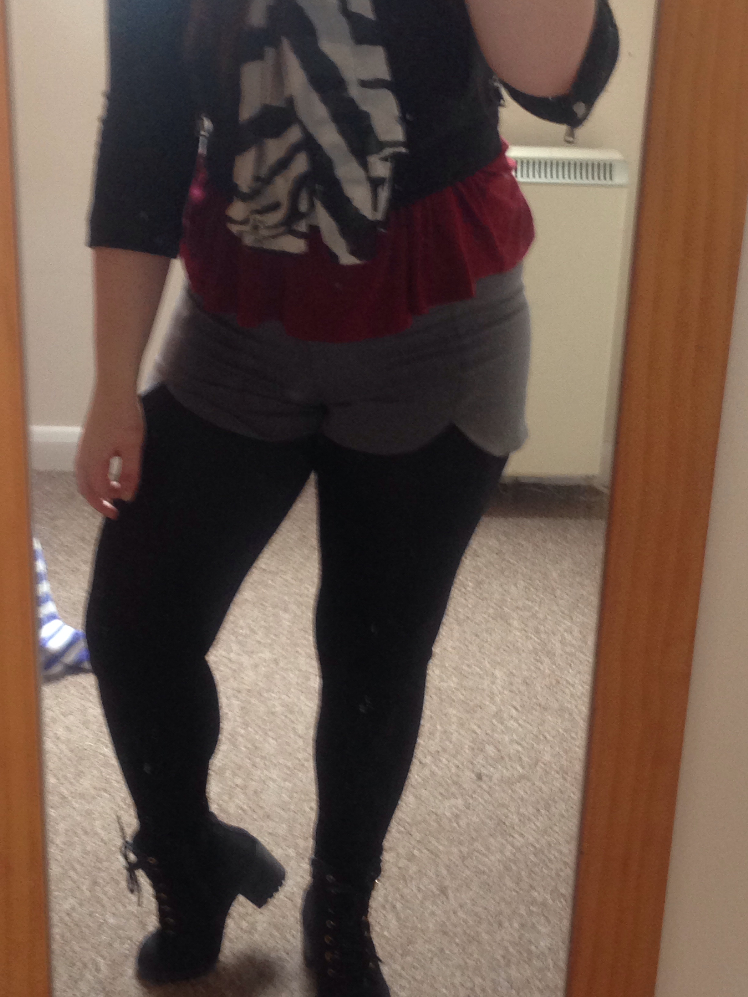Don’t you just love it, when you just chuck on some clothes and it all comes together really nicely? This is what happened to me on Saturday, after thinking I was going to have another long battle with the wardrobe. In fact I think my outfit looks better, when I’m in more of a rush to get ready. It’s getting a bit colder now and I think now it’s October it’s acceptable scarf weather. I like this monochrome one, as it’s quite a thick scarf, I know the material isn’t thick but it keeps you warm. Underneath that I had a burgundy coloured basic vest and a black biker jacket layered over the top. I liked the effect of the cami vest underneath the jacket, as the bottom gave it a bit of a peplum look. Now these shorts I have not worn them ages. I love the little slits in the front and the round edge it gives. Just because it’s colder doesn’t mean you can’t wear your favourite shorts or skirt, just add tights or leggings like I did here. All that was needed was for me to put on my favourite ankle boots and tadarrrr! An outfit I was happy with was made!