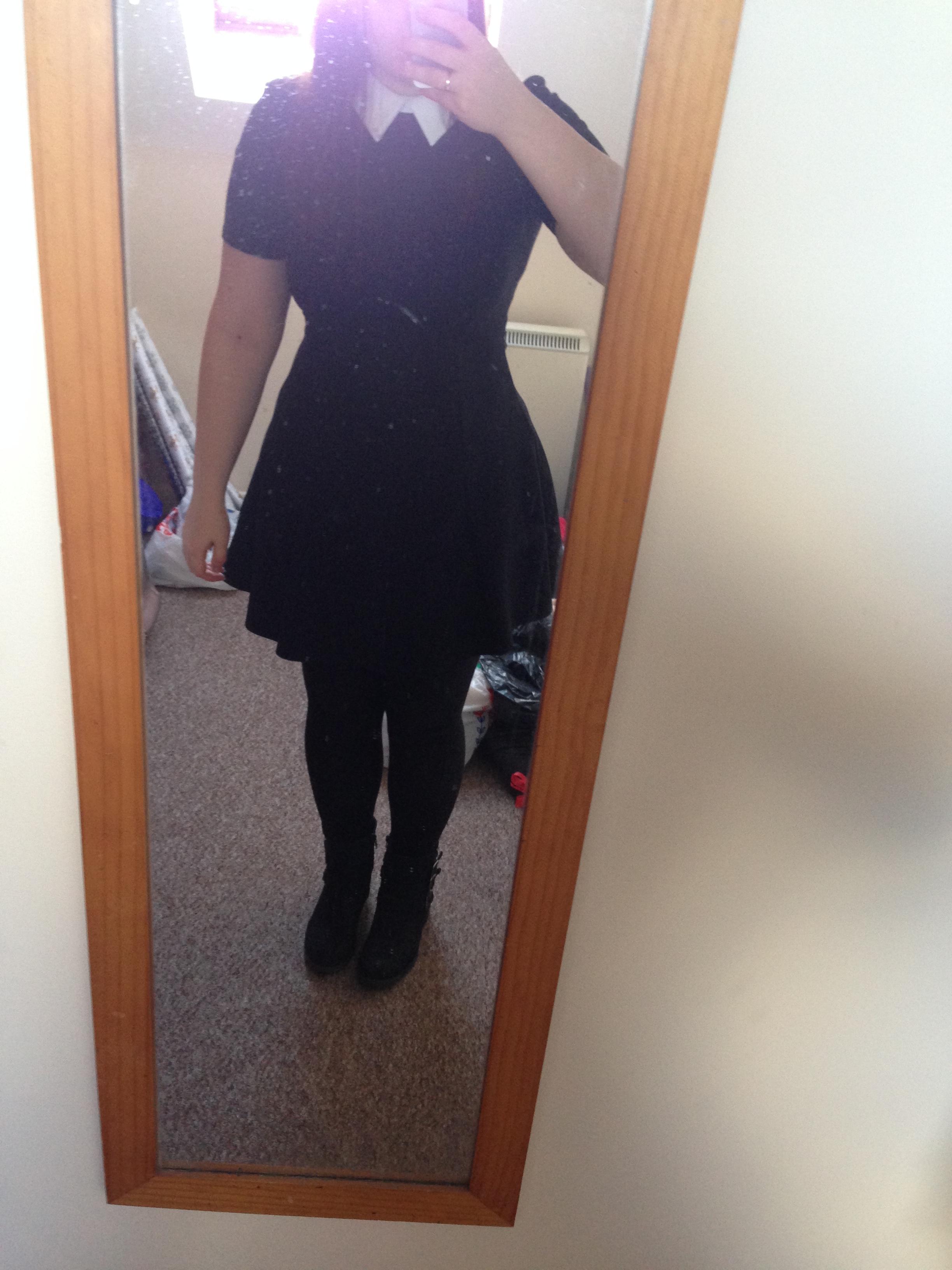 Usually I’d be happy it’s Friday however this means my week off is coming to an end! *does sad face* On the upside it will be then be closer to Christmas! It’s the last of my week of outfit of the days, and I though I’d finish it off with a dress. I don’t actually like wearing all black, ask me 10 years ago, that wouldn’t have been a issue. At the moment though wearing all of one colour seems to be a trend. I don’t usually like wearing things that are quite fitting however this makes you look slimmer. I love the white collar on this dress, it makes it look a lot smarter. I still need to invest in some tights, so leggings will have to do for now. Then to finish off, my ankle boots which have featured a lot this week. Doing these outfit posts have been a lot of fun, however I wish I could take better pictures. Anyone know a way of taking full length photos when your on your own?