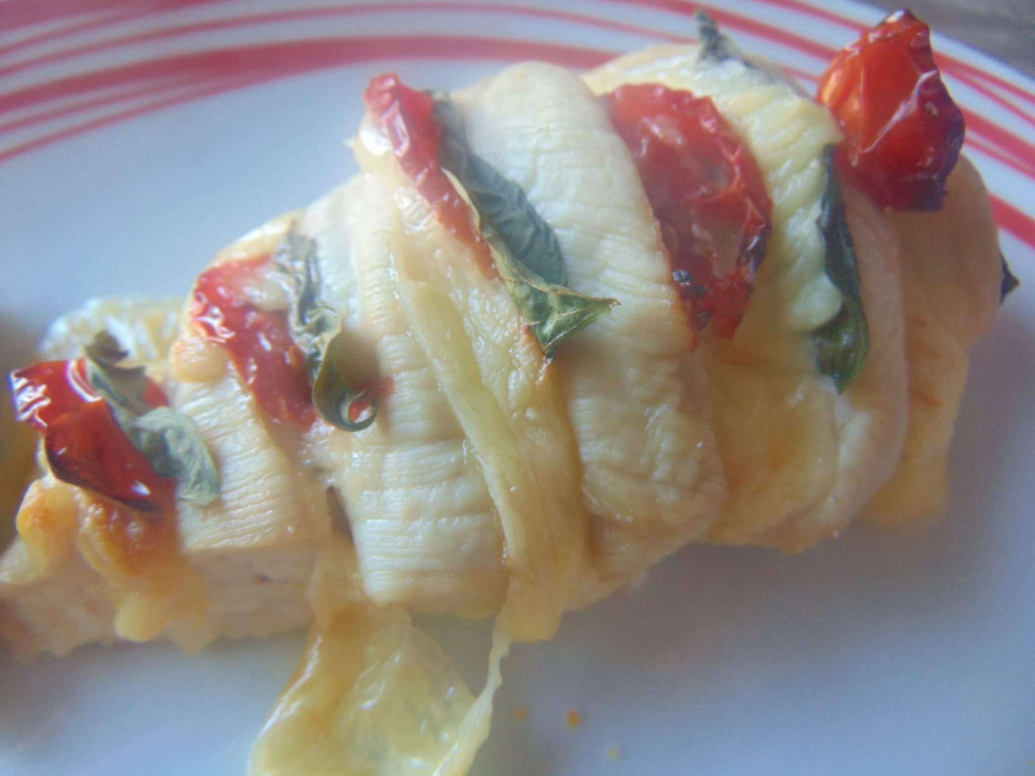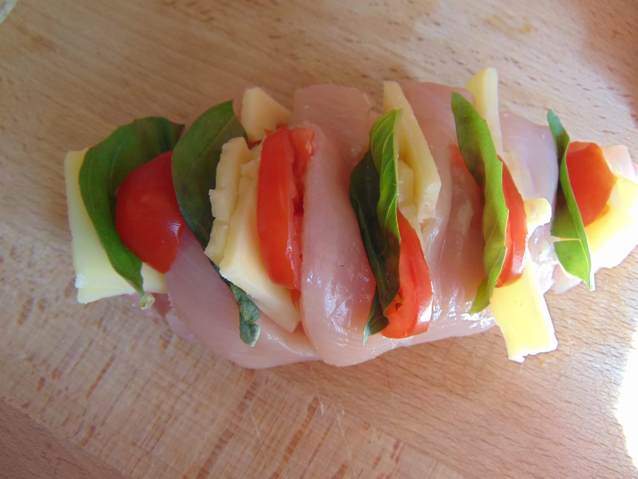 2. Fill the slits with the cheese, basil and tomatoes and then cook in the oven for 30 minutes.
